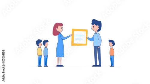 Obraz premium Collaborative Group Interaction with Document Exchange in Illustration