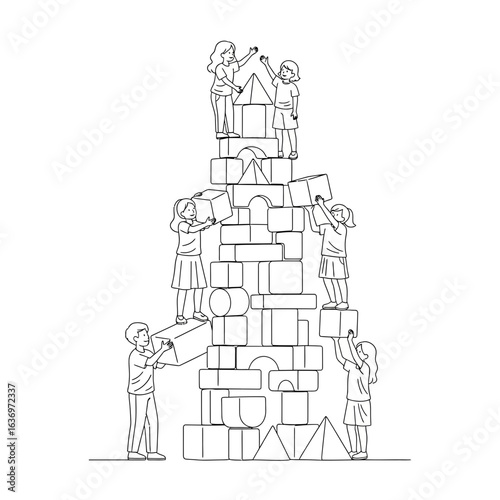 Fototapeta premium Collaborative kids building a tower of geometric blocks, showcasing teamwork and creative play, perfect for educational materials and children's content, originally a scalable vector graphic