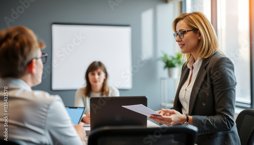 Fototapeta premium Collaborative Minds A Dynamic Office Meeting with Ideas Flowing, Brightened by Natural Light and Elegant Simplicity.