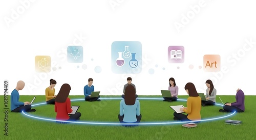 © bryanwisnu, Fototapeta premium Collaborative Online Learning: Diverse Students Connected in a Virtual Circle on Green Grass