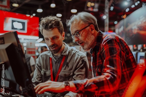 © Flow_control, Obraz premium Collaborative Tech Discussion at Modern Conference - Two Professionals Engaged in Learning and Networking