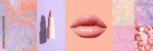 Obraz premium Collage of Beauty Icons Featuring Lips, Brush, and Bottle on a Pastel Colored Backdrop With a Clean Left Side Design