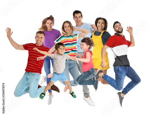 © New Africa, Fototapeta premium Collage of emotional people jumping on white background