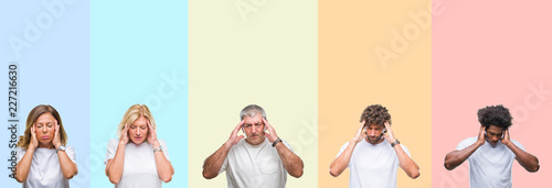 © Krakenimages.com, Naklejka premium Collage of group of young and middle age people wearing white t-shirt over color isolated background with hand on head for pain in head because stress. Suffering migraine.