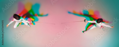 Fototapeta premium Collage of 1 teen girl in fencing costume with sword in hand on gradient background in neon light. Top view. Young model practicing, training in motion, action. Copyspace. Sport, youth, healthy