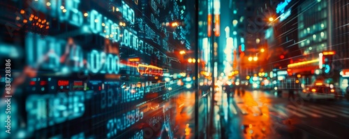 © nunoi, Naklejka premium Collage of ticker symbols with scrolling market information, trading charts, and financial indicators