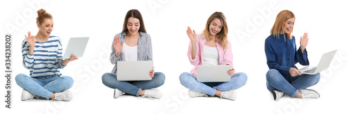 © New Africa, Naklejka premium Collage of women with laptops on white background. Banner design