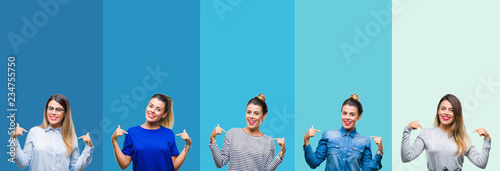 Fototapeta premium Collage of young beautiful woman over blue stripes isolated background...