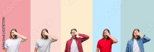 © Krakenimages.com, Naklejka premium Collage of young handsome man over colorful stripes isolated background peeking in shock covering face and eyes with hand, looking through fingers with embarrassed expression.