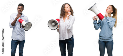 © Krakenimages.com, Fototapeta premium Collage of young people yelling through megaphone over isolated background serious face thinking about question, very confused idea