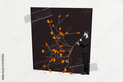 Obraz premium Collage standing young gentleman musician player artist performer trumpet instrument symphony player organic tree autumn season leaves