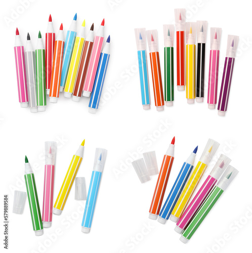 Obraz premium Collage with many colorful felt tip pens on white background, top view