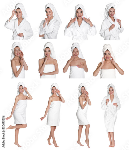 Naklejka premium Collage with photos of beautiful young woman with towels on white background