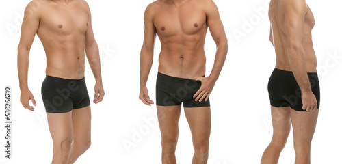 Fototapeta premium Collage with photos of man wearing underwear on white background, closeup....