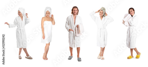 Fototapeta premium Collage with photos of people with soft towels on white background. Banner...
