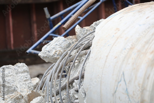 Fototapeta premium Collapsed bridge piers, bottom view of concrete piers caused by collapse