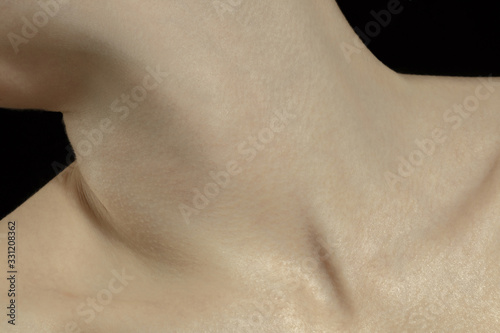 Fototapeta premium Collarbones. Detailed texture of human skin. Close up shot of young caucasian female body. Skincare, bodycare, healthcare, hygiene and medicine concept. Looks beauty and well-kept. Dermatology.