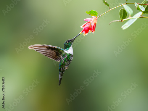 © FotoRequest, Obraz premium Collared Inca hummingbird in flight collecting nectar from red flower on green background