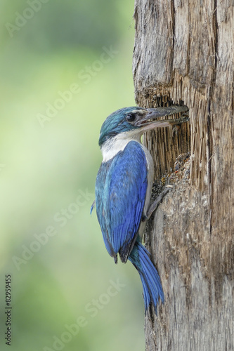 © Art789, Obraz premium Collared Kingfisher, Bird carry prey for juvenile bird in nest