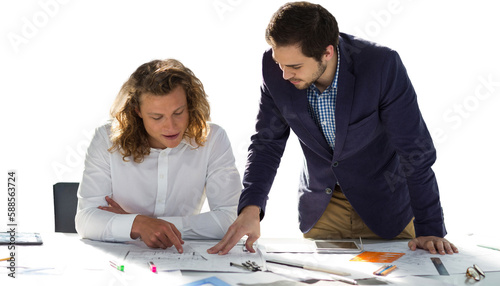 Fototapeta premium Colleagues discussing at table against white background