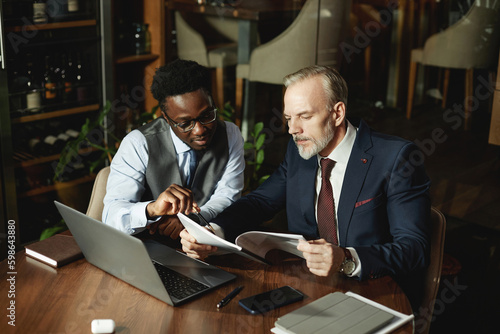Fototapeta premium Colleagues examining contract together while sitting at table with laptop during their meeting in cafe