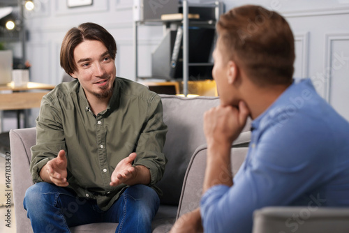 Obraz premium Colleagues having conversation during break in armchairs at office