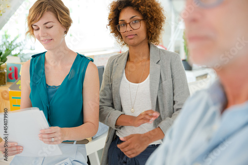 © KOTO, Obraz premium Colleagues talking and smiling in office, holding documents