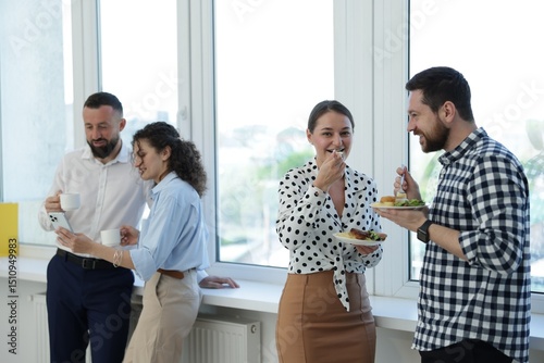Obraz premium Colleagues with food and drinks near window in office during lunch break