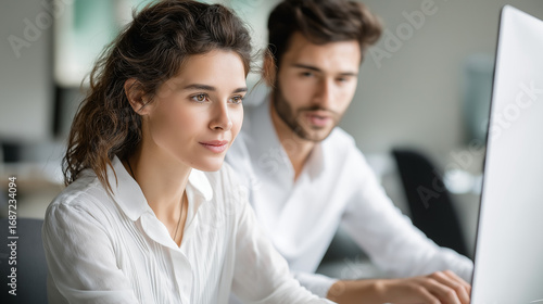 © Kateryna Arkhypova, Fototapeta premium Colleagues work on a computer, the focused scene illuminated by soft light. Colleagues, computer, with copy space