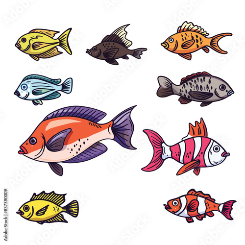 © Vectorvstocker, Fototapeta premium Collection colorful tropical fish cartoons isolated white. Vibrant marine life aquatic creatures illustration. Set exotic fish species drawings, handdrawn animal designs