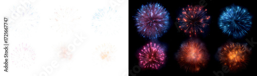 © NightTampa, Naklejka premium Collection Fireworks Bursting in Various Patterns and Shades Display on Transparent and Black Background, png
