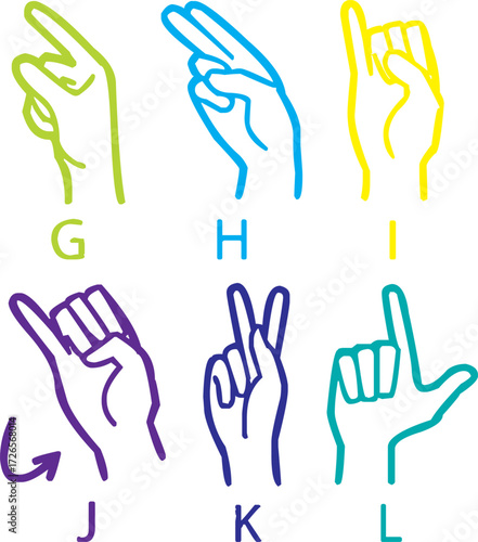 © Tahmina, Fototapeta premium Collection of American Sign Language (ASL) hand gesture illustrations. Includes alphabet letters, basic signs, and symbolic hand shapes. Perfect for educational materials, accessibility projects,