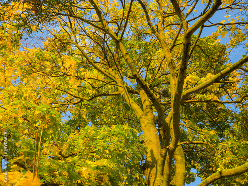© Digital Mammoth, Fototapeta premium Collection of Beautiful Colorful Autumn Leaves / green, yellow, orange, red at outdoor park, a park of luminous autumnal colors, Golden scene with falling leaves, the sun shining through the trees.