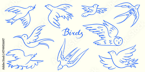 © artbalitskiy, Fototapeta premium collection of beautiful one line birds. peace symbols. Owl , dove and swallow. Colibri one line hand drawn engraving.