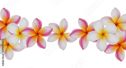 © masud, Naklejka premium Collection of beautiful pink and white frangipani flowers forming a decorative floral border on a white background, perfect for a tropical or spa theme