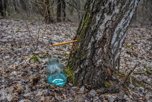 © wiha3, Obraz premium Collection of birch juice with a glass bottle .