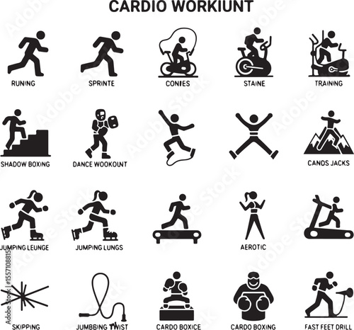 © Besticon25, Naklejka premium Collection of black and white silhouette icons representing various cardio exercises and fitness activities