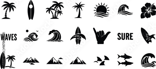 © kahatal, Naklejka premium Collection of black and white surf and beach themed icons and symbols