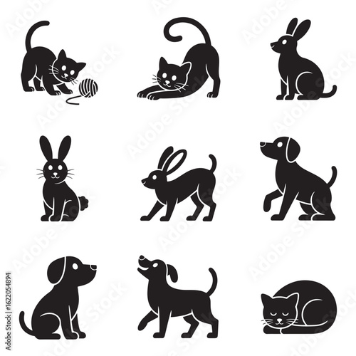 Obraz premium Collection of Black Animal Silhouettes including Cats Dogs and Rabbits Set...