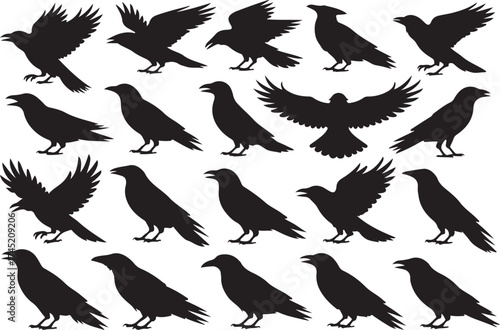 Obraz premium Collection of black bird silhouettes in various poses and flight actions