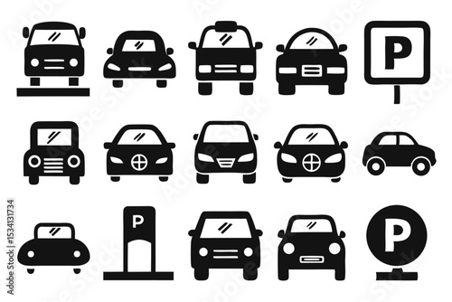 © ForhadGFX, Fototapeta premium Collection of black car icons and parking signs with simple flat design elements