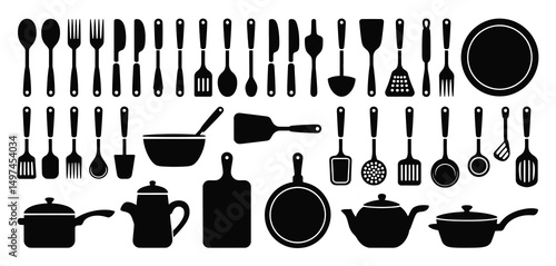 Fototapeta premium Collection of Black Kitchen Utensils and Cookware Icons