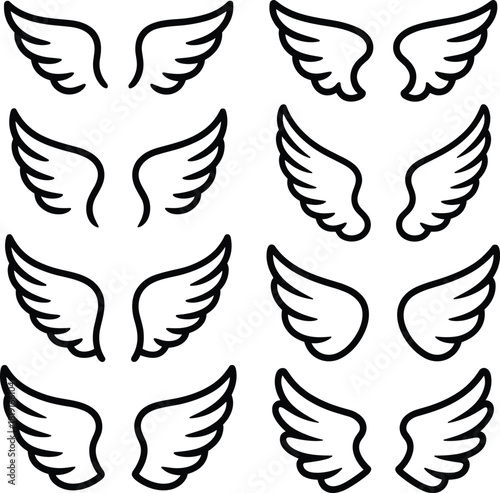 © Kingkor, Obraz premium Collection of Black Outline Wings on White Background