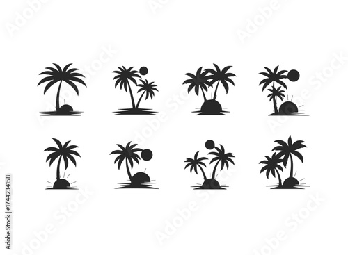 © mdsohag, Fototapeta premium Collection of black palm tree and sun silhouette icons on