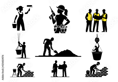 © Anukul Debnath, Naklejka premium Collection Of Black Silhouette Illustrations Showcasing Various Construction Workers