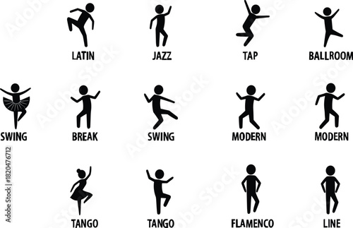 © Obaidul Vector Zoon, Naklejka premium Collection of black stick figure dance icons with labels silhouette latin