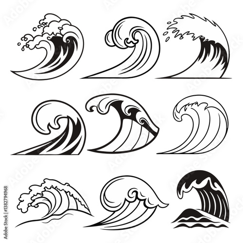 © Asad, Fototapeta premium Collection Of Black Wave Icons Ocean Sea Water Illustration Multiple Objects Isolated On White Background