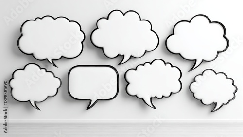 © The Little Hut, Fototapeta premium Collection of Blank Speech Bubbles on a White Wall: Communication, Discussion, and Idea Concept
