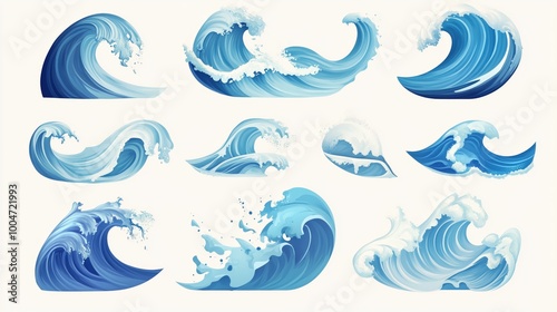Fototapeta premium Collection of blue wave illustrations. The waves are of various sizes and shapes, with some being more pronounced than others