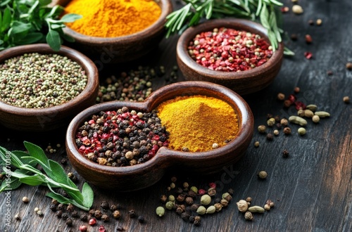 © Aranya, Fototapeta premium Collection of bright spices in ceramic bowls with scattered herbs on a